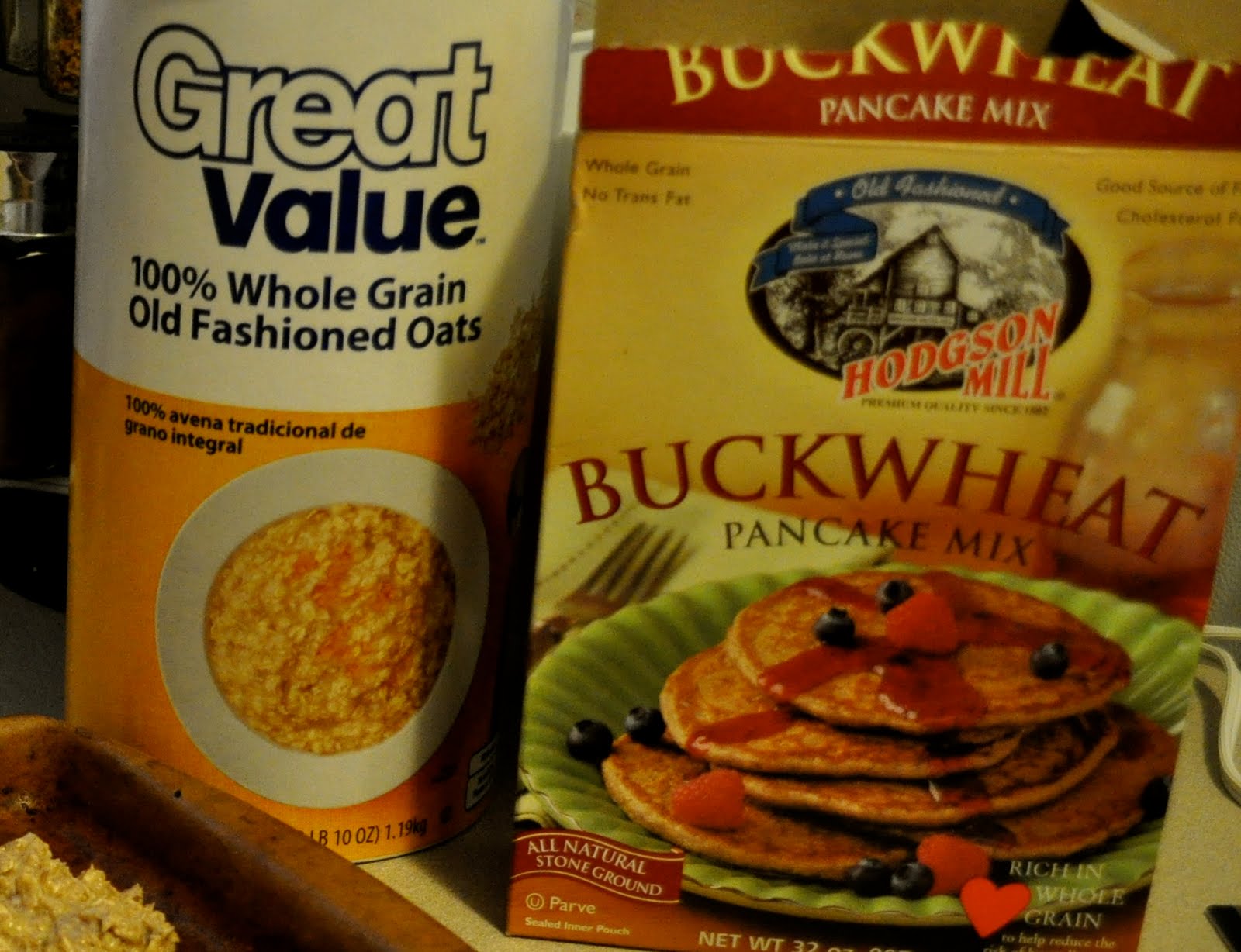 Banana Bread seems to be kind of an “uh-oh” dessert, at least in my kitchen. I don’t usually buy bananas with the intention of making banana bread. I want to eat them for breakfast, but they tend to ripen faster than I expect. The chain of events leading up to me making banana bread usually starts that morning. I fix my coffee, then reach for a banana and realize — uh-oh — they are too ripe to really eat by themselves. Time to make bread. Today’s recipe is even more of an “uh-oh” recipe. In addition to not wanting to waste the bananas, I wanted to make healthy bread — no white flour, no white sugar. Unfortunately, when I got the wheat flour out of the freezer, I realized that it had freezer burn. Wheat flour, no go. The only other flour-type options left in the pantry were buckwheat pancake mix and cooking oats.