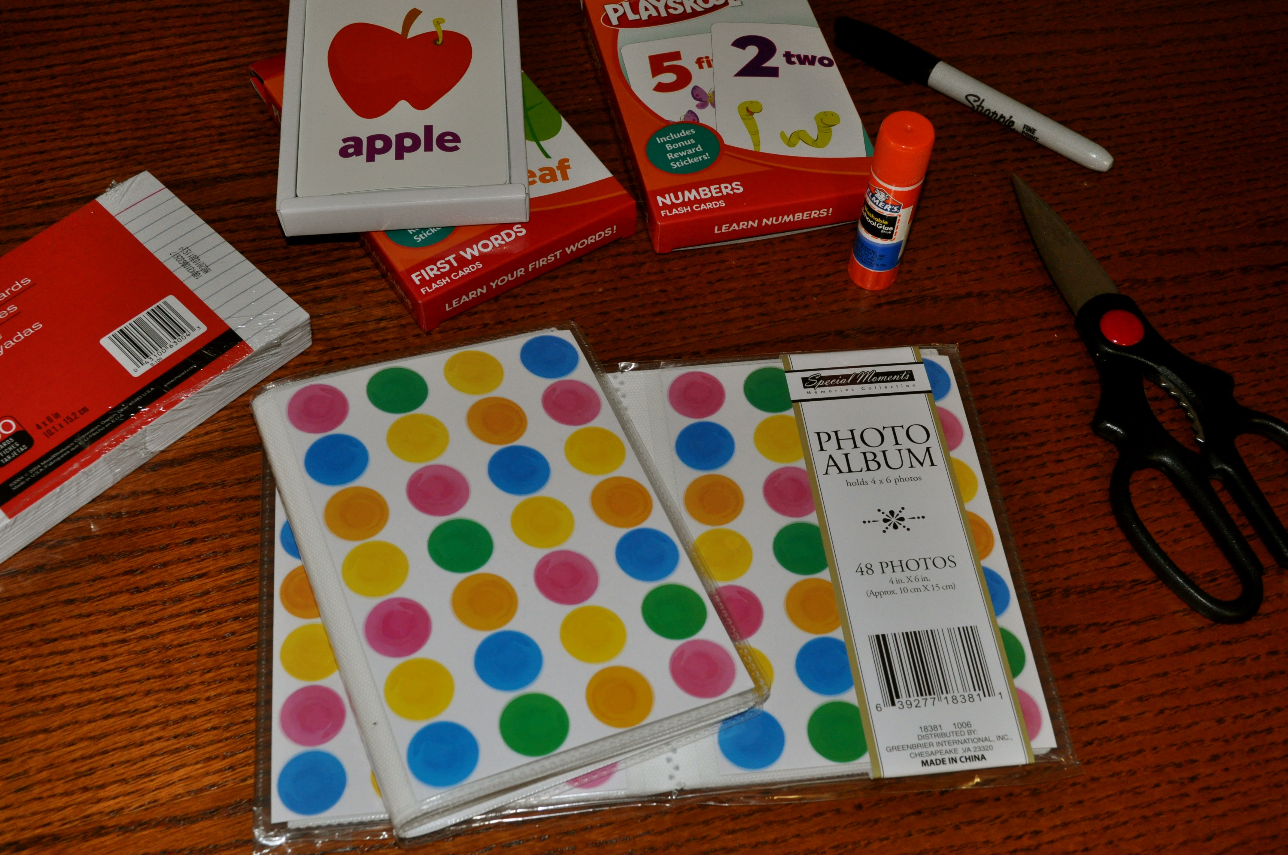 The students I teach are Kindergarten and 1st grade. There is a wide range of reading ability between them. For the literacy center activity, I wanted to include books that emphasized vocabulary, but also had an option of stretching the student’s reading skills. I had previously purchased First Word and Numbers flashcard from the Dollar Tree. Since I didn’t think flashcards would work well as a center activity, I decided to put them in photo albums (also from the Dollar Tree).