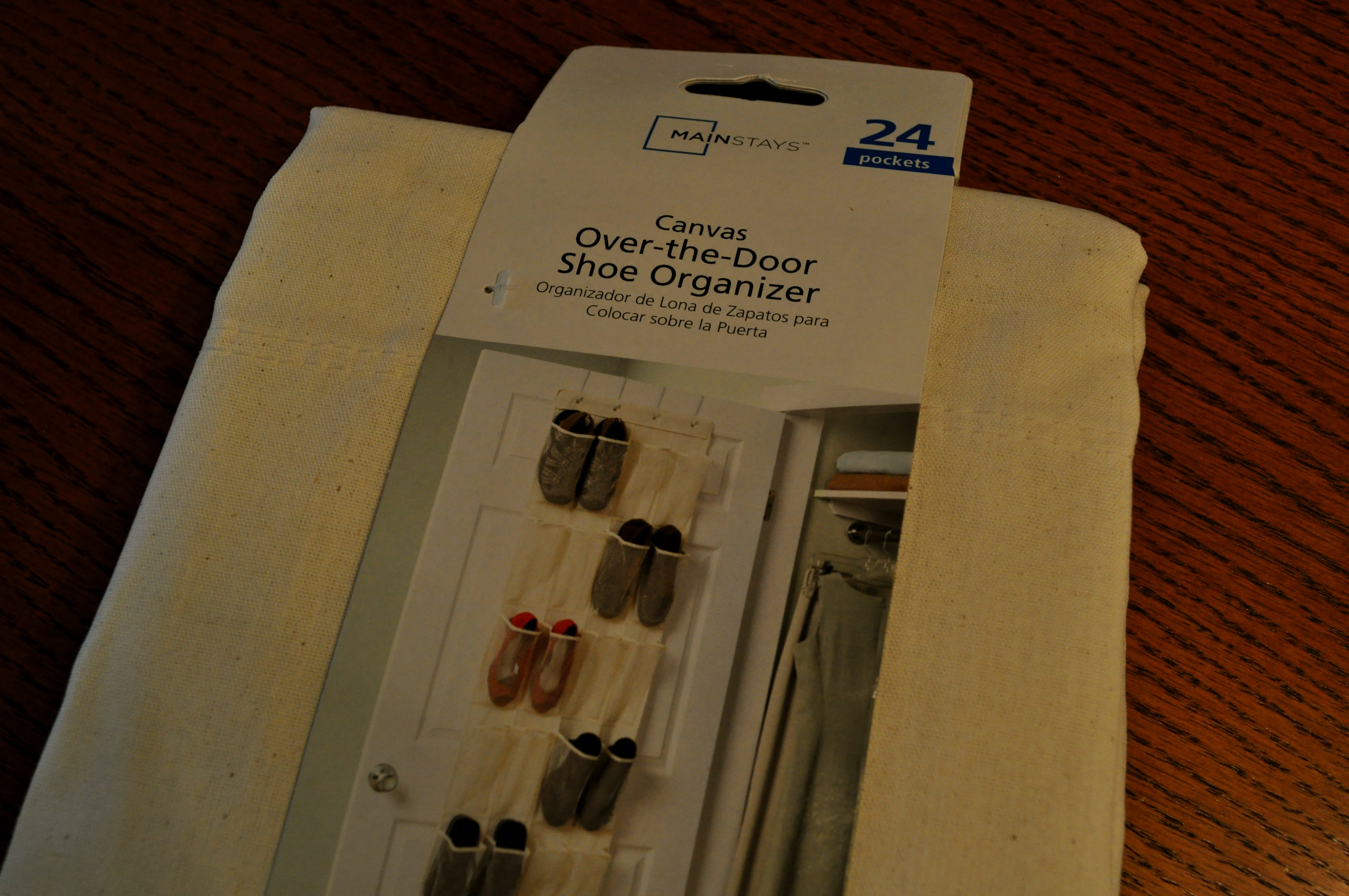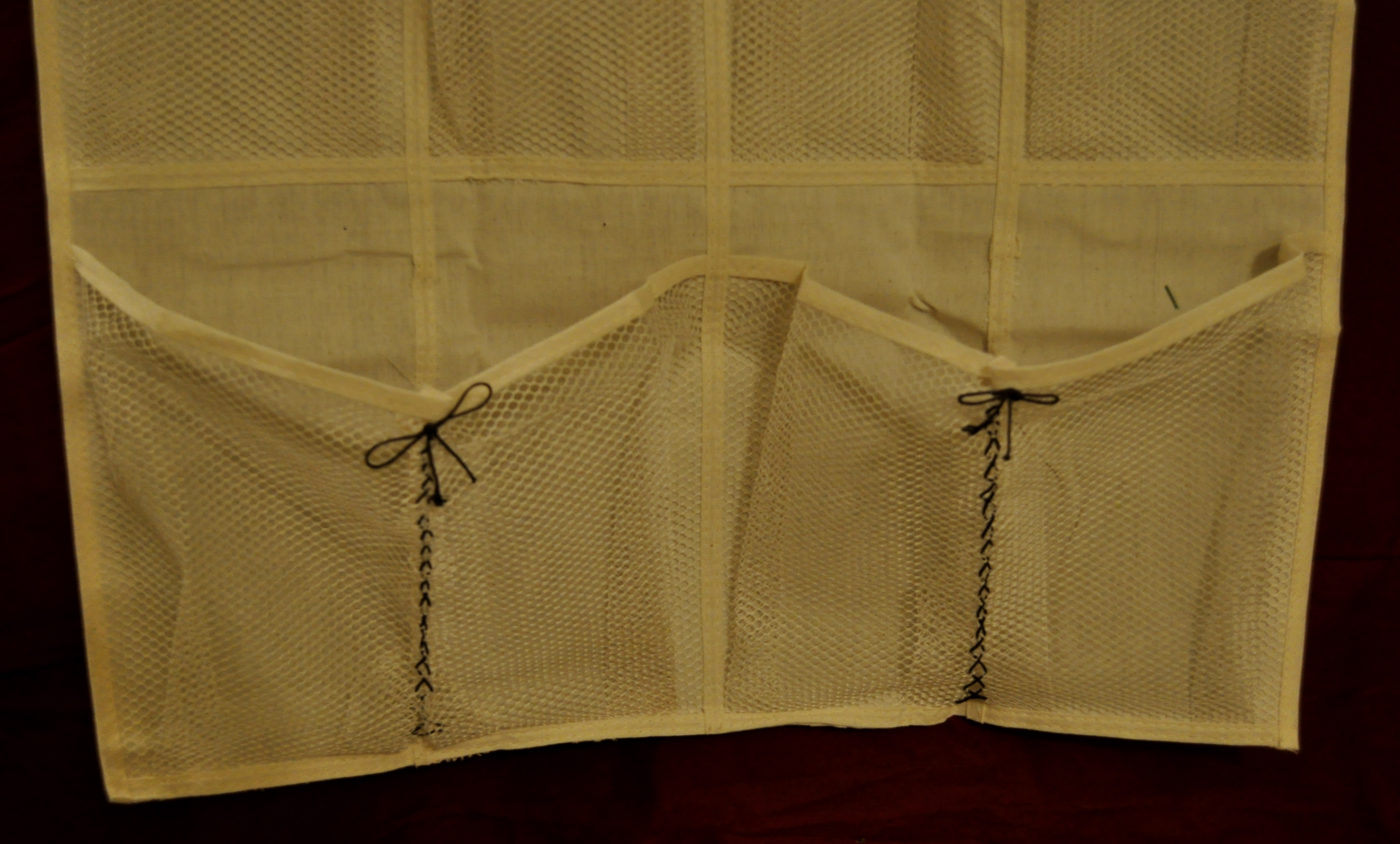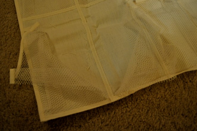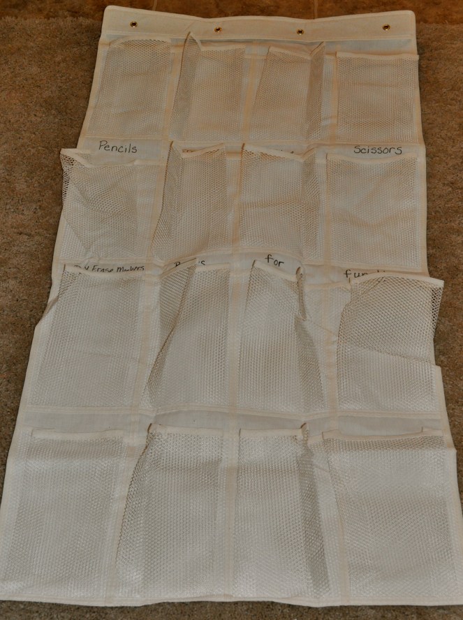 I got the kind with netting for the pockets. I plan to attach the organizer to the wall with adhesive hooks so that the whole thing is accessible to my kindergarten students. Since the organizer was too long (based on the height of my students), I cut off the bottom two rows. Who knows, maybe I can use it to make an over the desk/table organizer…