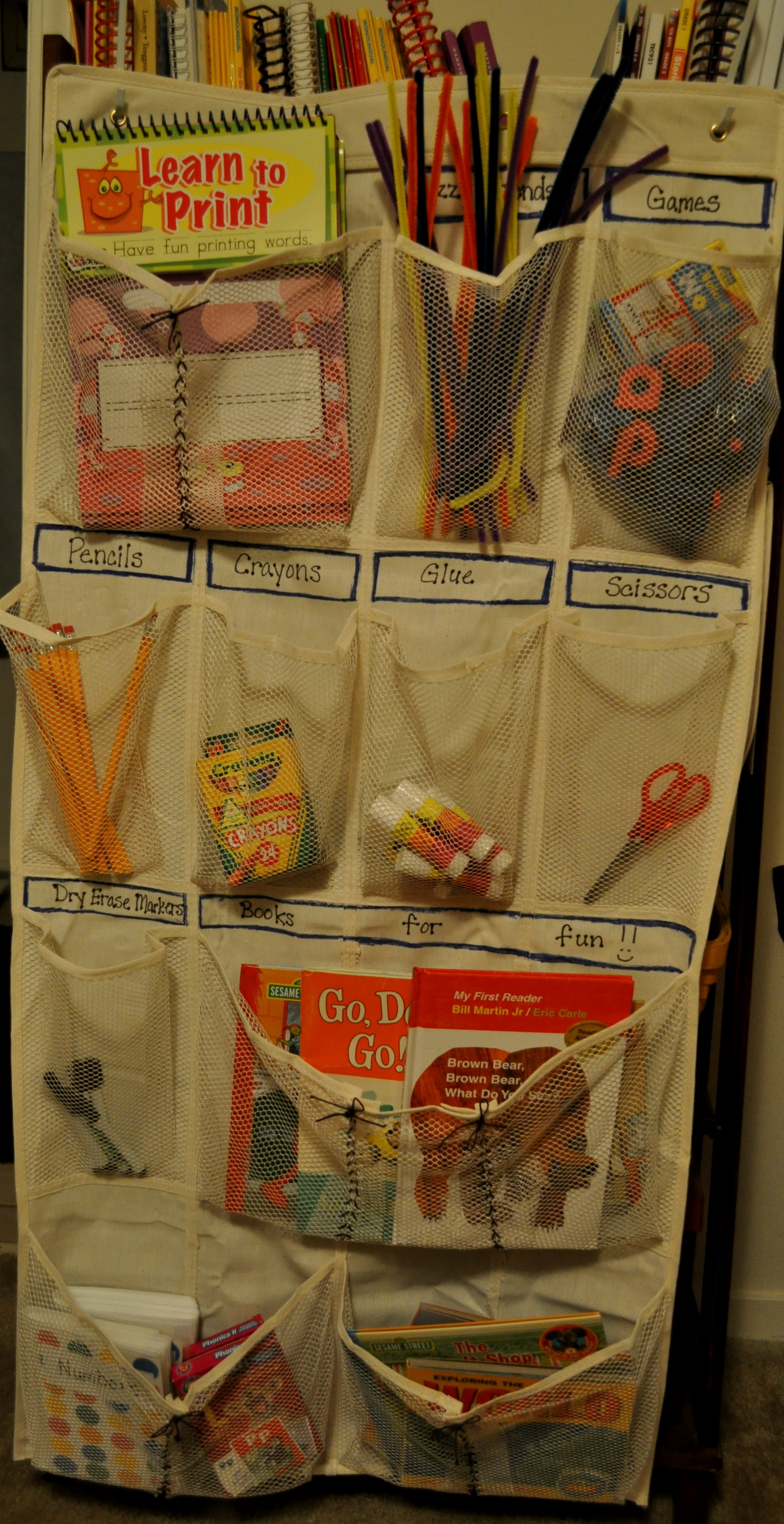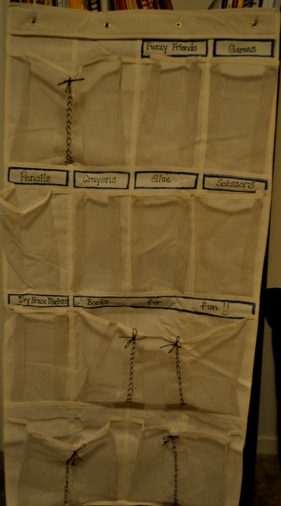 I had thought about getting a bookshelf that was accessible to my students. This would free up more time for me to teach because I wouldn’t need to hand them everything. It would also be safer than my kindergarten students getting things off the higher shelves themselves. Since I didn’t really have the space for another bookcase, I decided to make a hanging wall organizer. Hanging organizers similar to this one are $30+ at the teacher store in town. This one was make with a $10 organizer from Wal-mart, string from another project, and a couple sharpies.