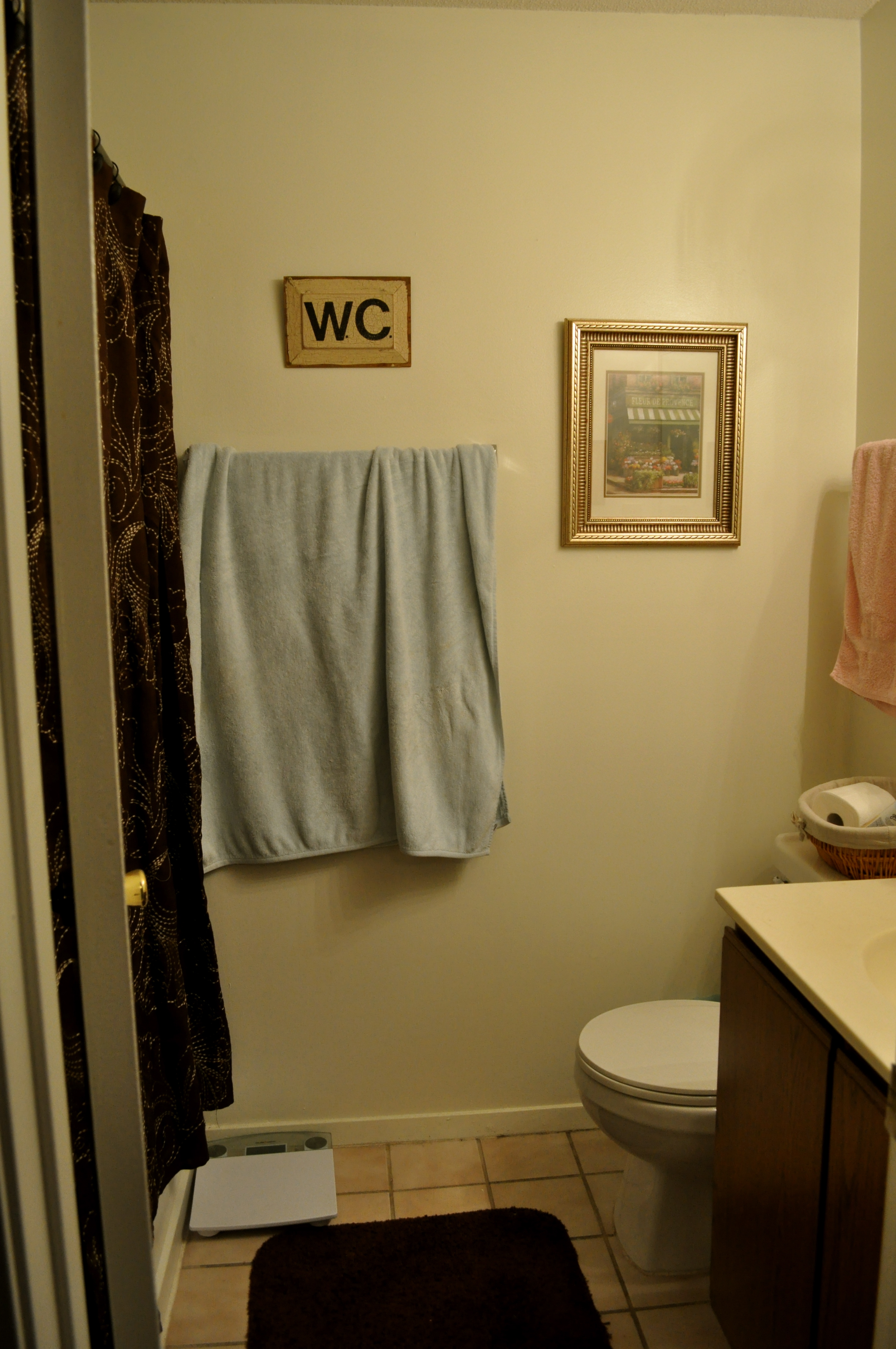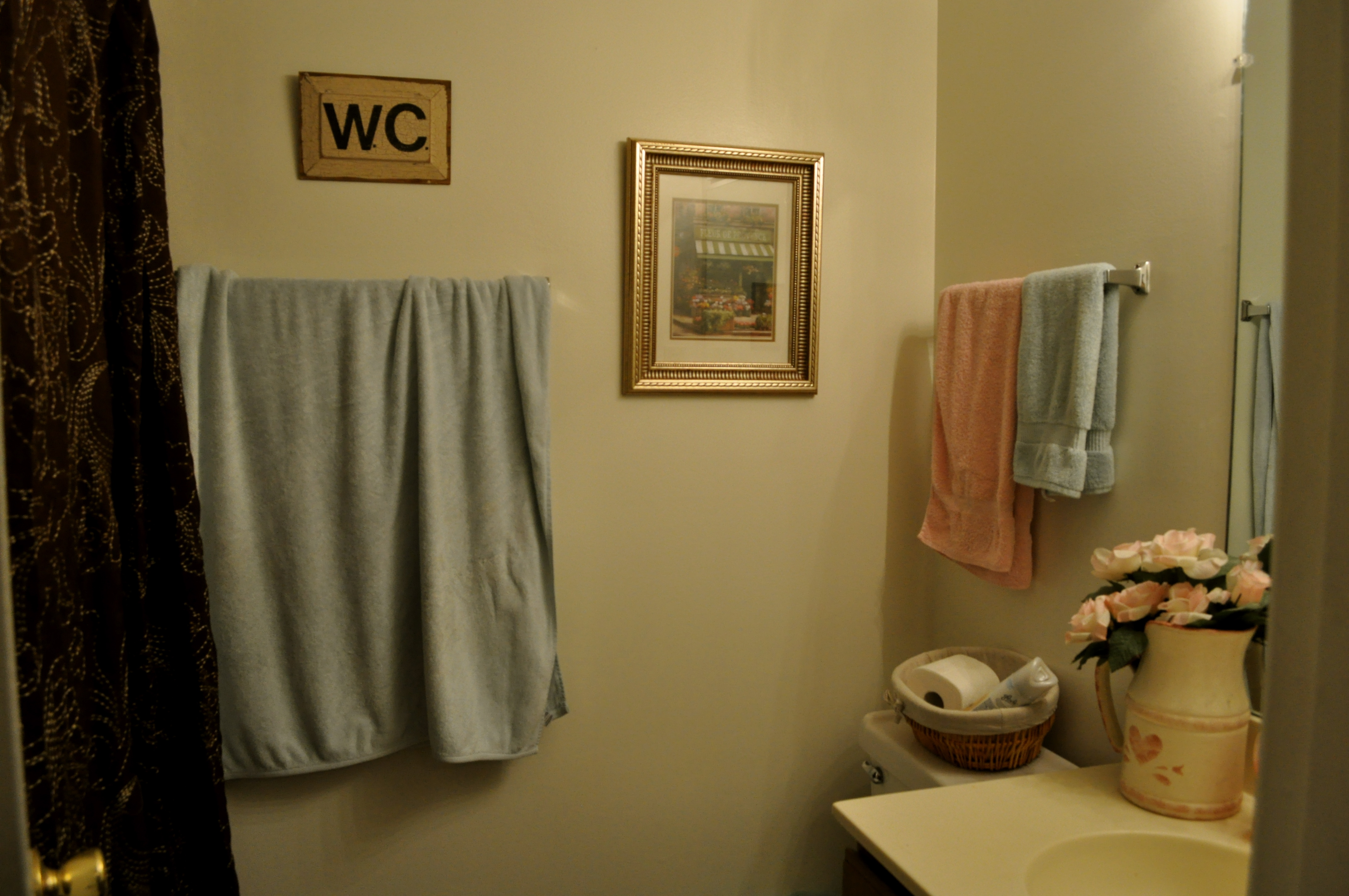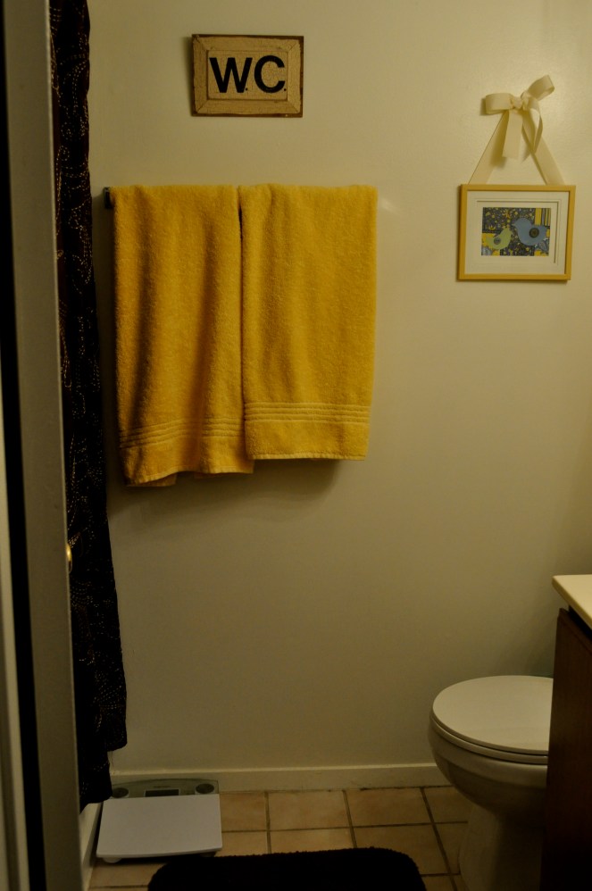 After giving a lot of thought to the matter, I decided to trade out the old pink and blue towels for yellow towels. The WC sign was my favorite decoration in the room, so I kept it. The other decor I traded for the following: