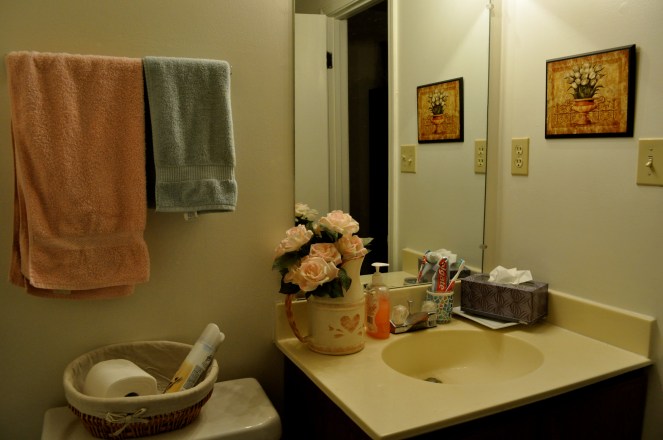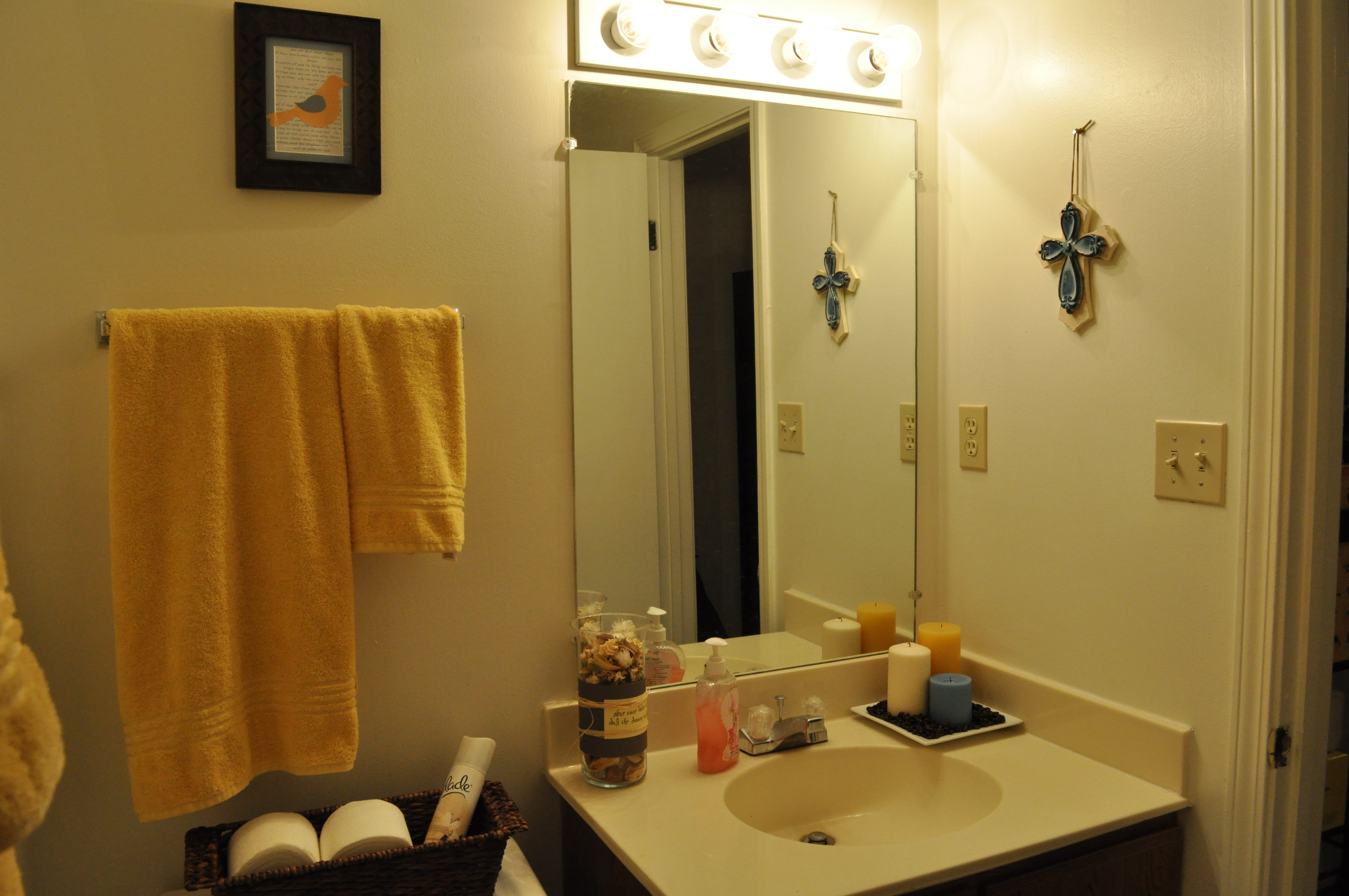 Friday, since I was able to enjoy another snow day, I decided to see if I could do something different with my bathroom. The limits I had were 1.) it shouldn’t take longer than a day, and 2.) it shouldn’t cost very much (I am in the process of getting curtains for the living room…). I also wanted to try some paper-crafting. It actually took me two days to finish it, but I think it was worth it.
