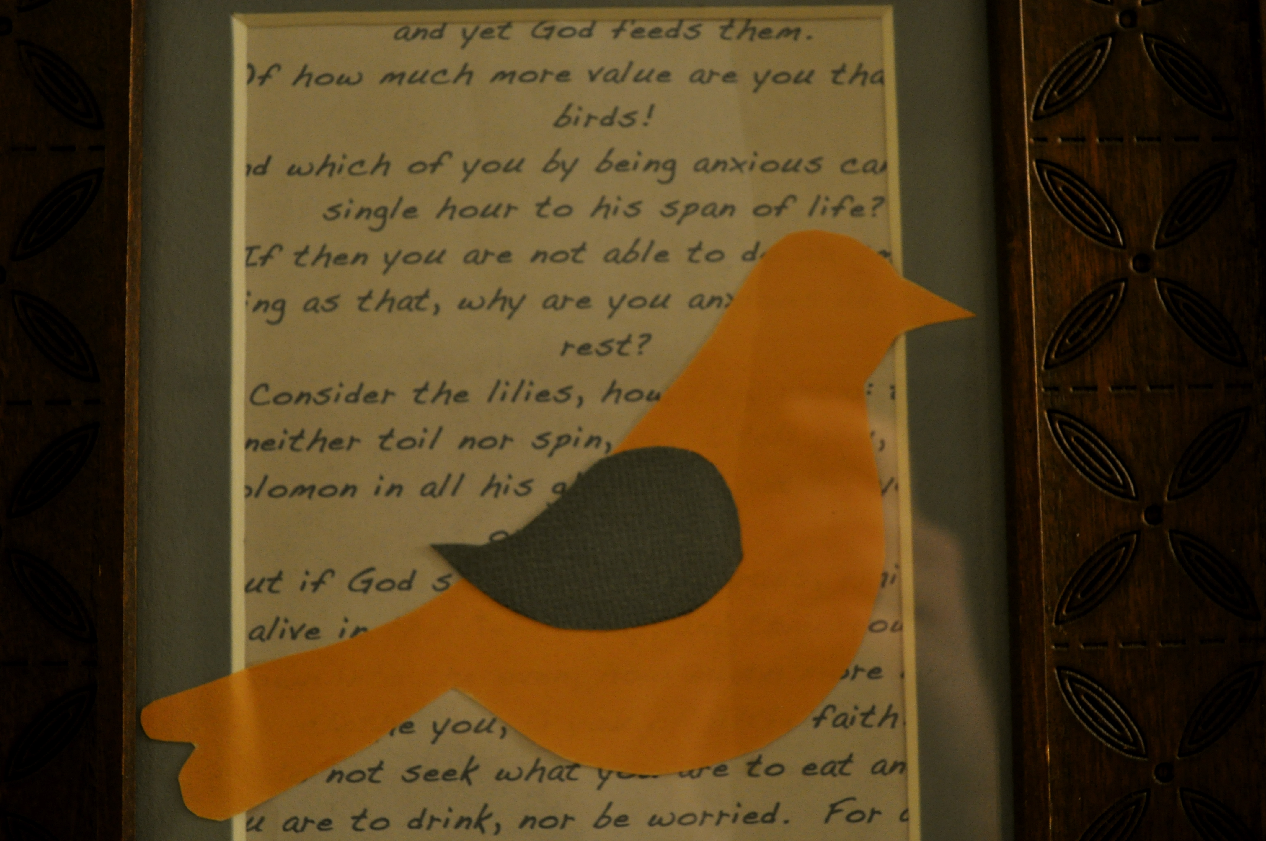 This frame and mat were from Hobby Lobby. The bird was a paper cut-out and the background a print off from my computer. The text is Luke 12:24-32.