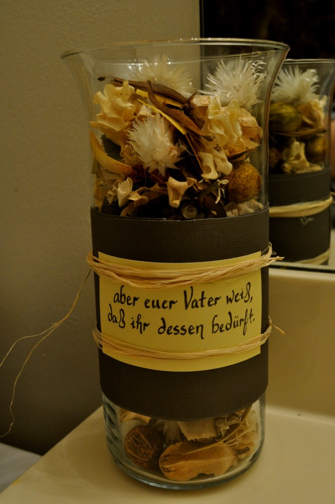 The potpourri came from Target, but I already had the vase. The paper came from my scrapbook paper supply. The writing is the German translation for “and your Father knows you need them”, an excerpt from Luke 12:30.