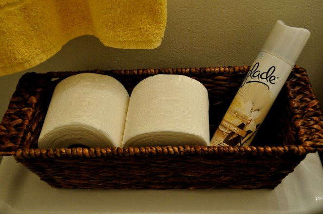 This is a bread basket (of all things) from Target. It was cheaper than the other storage boxes — and the toilet paper fit perfectly.