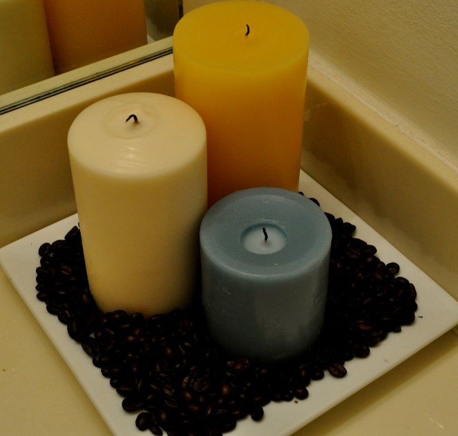 The candles were leftover decorations (the yellow one was new from Target) and the coffee beans were off-brand that I was saving for a craft/decorating project. The plate was a regular salad plate from Wal-mart that I had put the tissues on earlier.