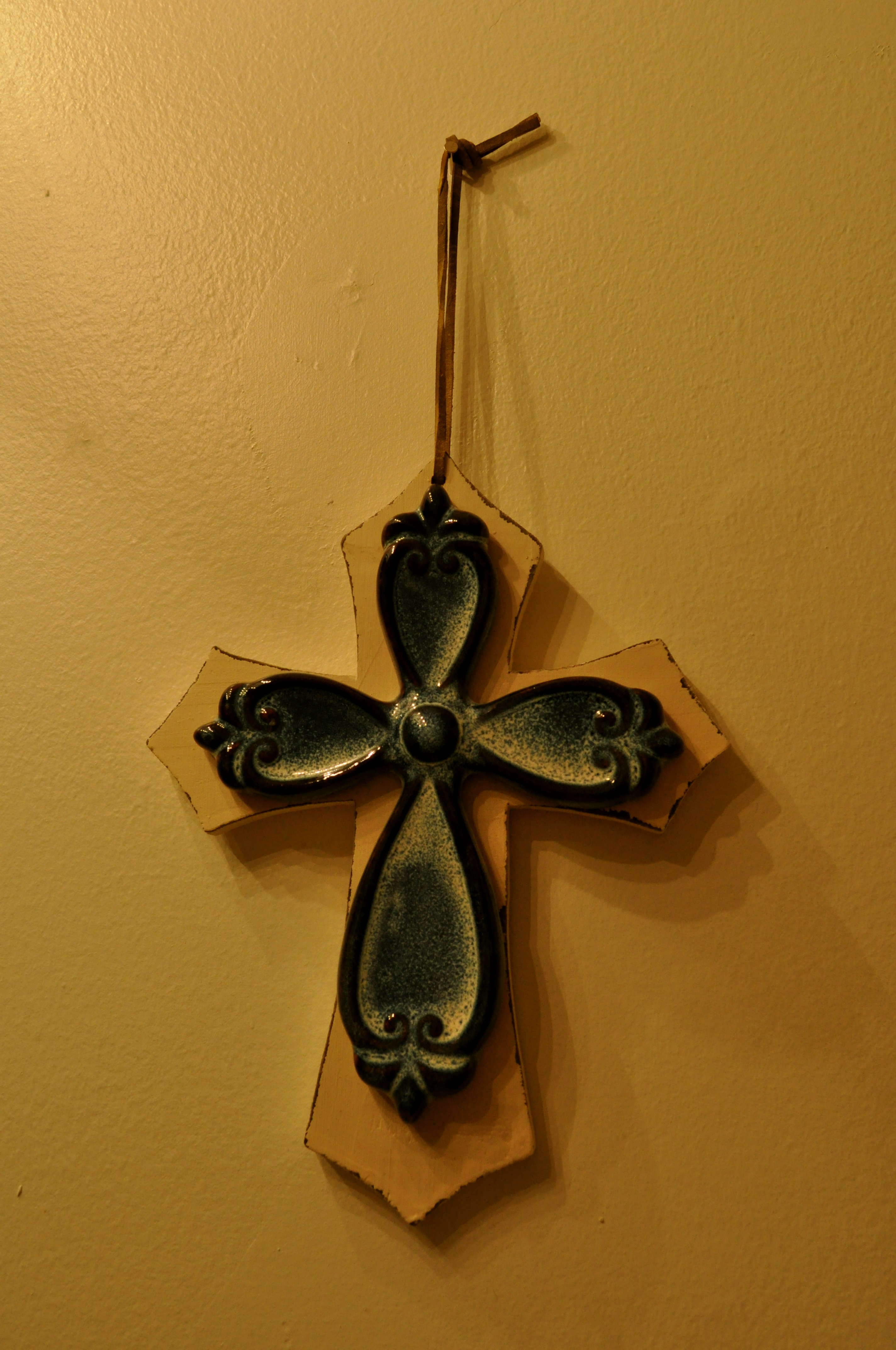 I had moved my big blue cross from my bedroom to the bathroom, but I really missed having it in its old spot. This smaller cross was 3.50 at Hobby Lobby.