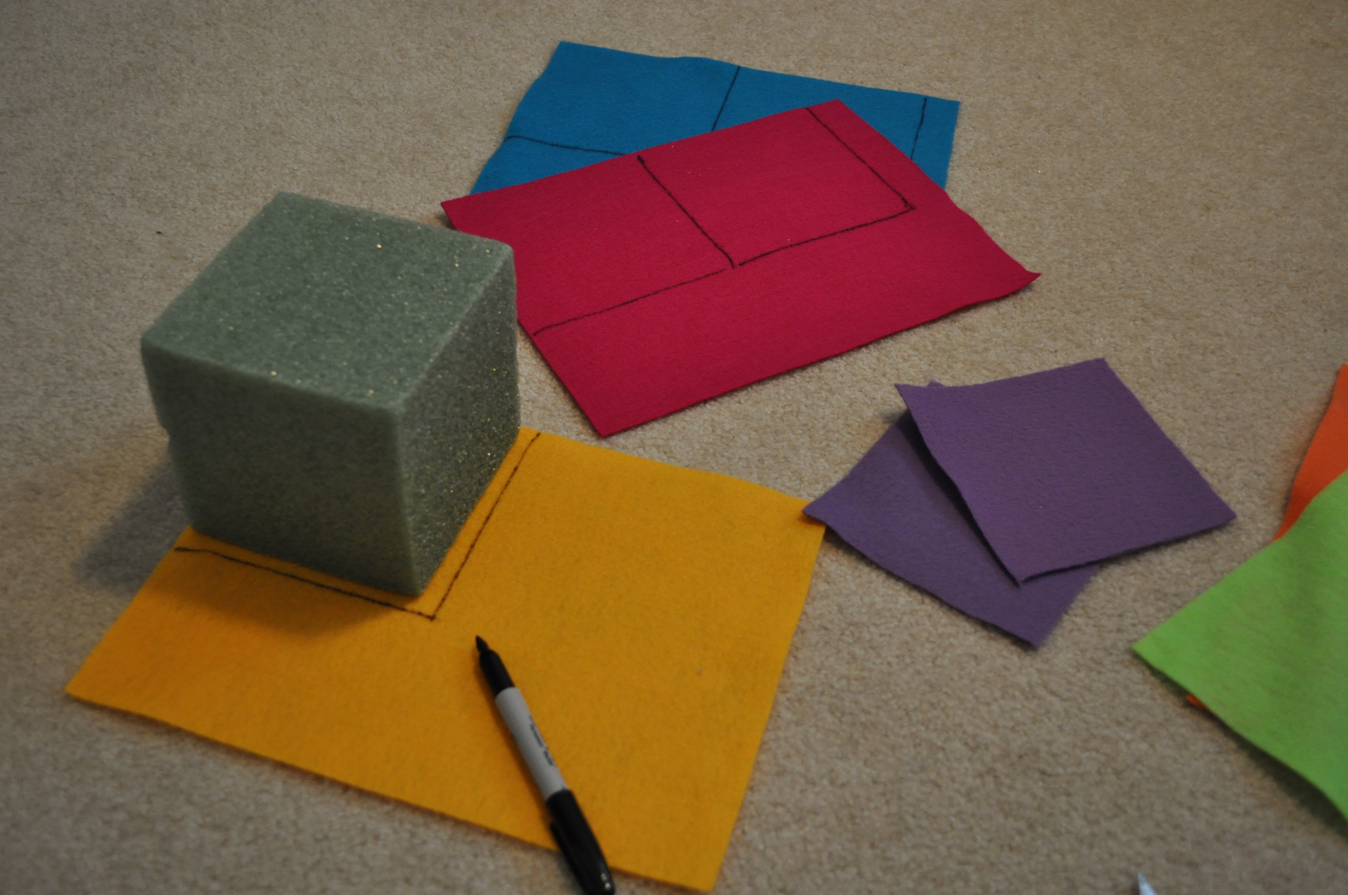 First, I traced and cut the felt into squares that were about 1/4 inch (or less) larger than the cube’s sides.