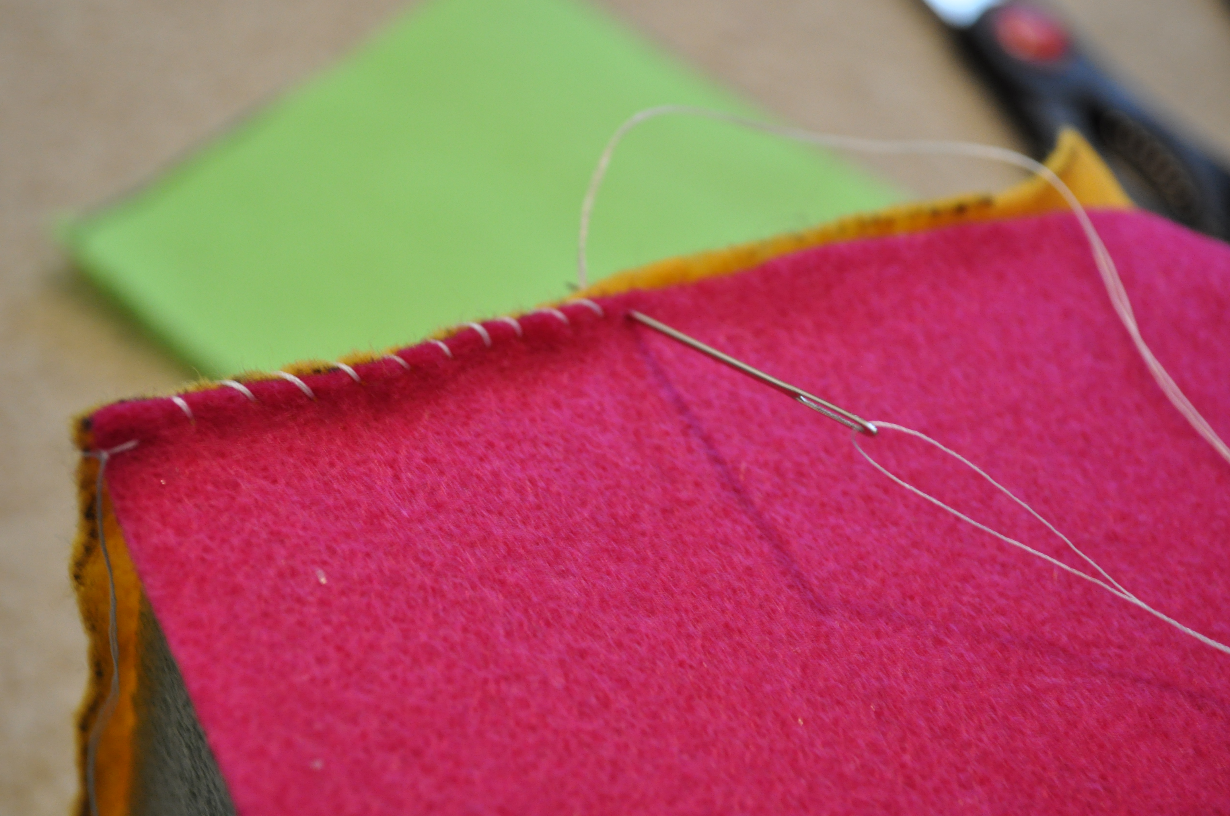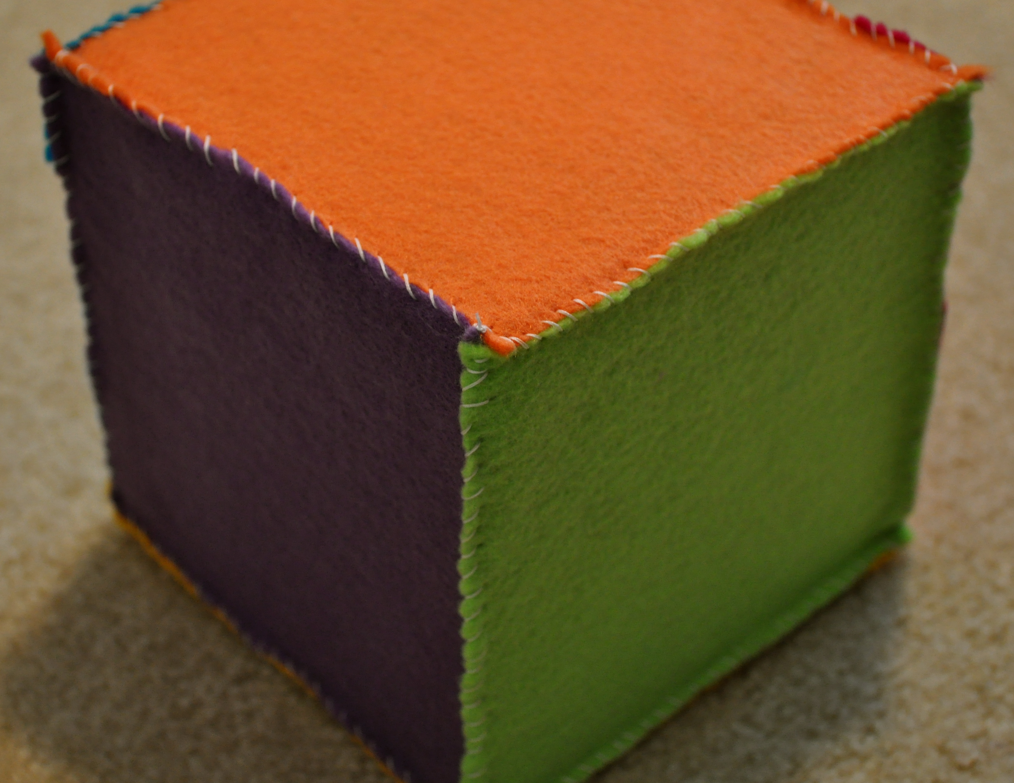 I glued the felt squares to each side of the cube with rubber cement to help keep it in place while I sewed the pieces together. Then, I sewed the sides so that the seams created a ridge.