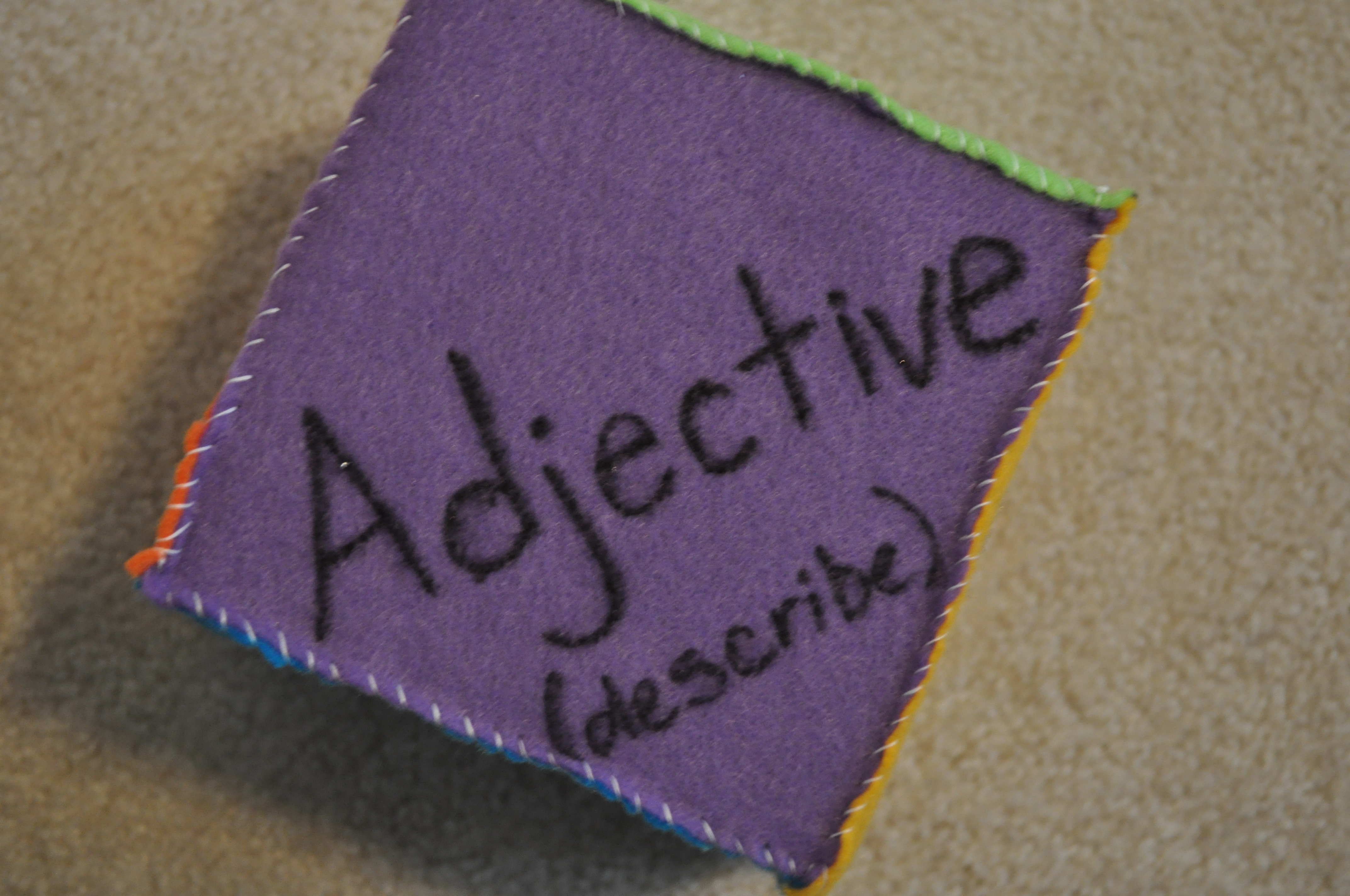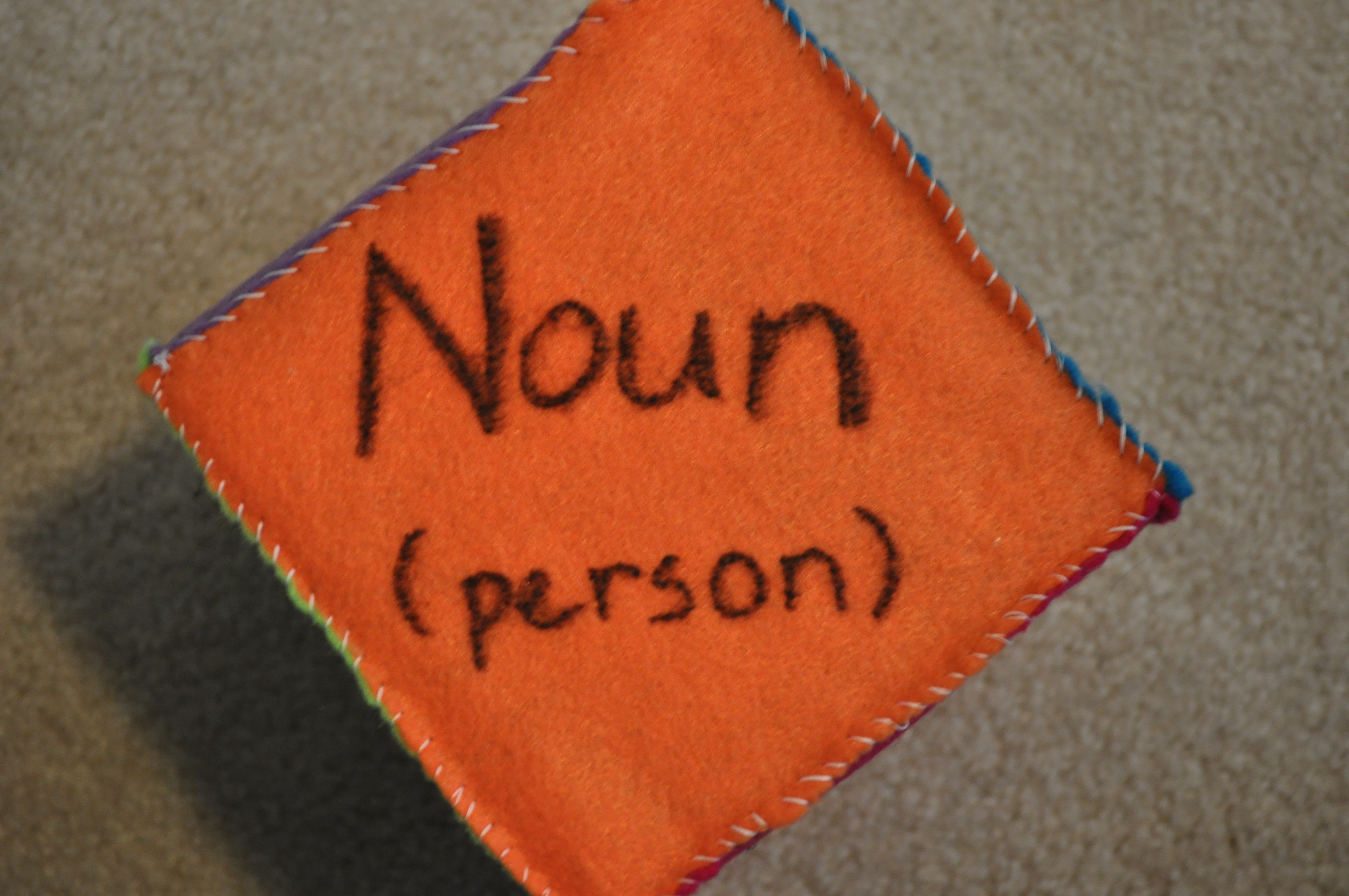 This cube is intended to use with the word wall in my classroom. We are just moving into learning about parts of speech, so I think this will come in handy very soon. The students will roll the dice, see which part of speech they get, find such a word on the word wall and then use it in a sentence. I got the idea from a reading comprehension cube in a friend’s classroom. I have enough material and a foam cube for another dice, so I may make one of those too. All that’s needed are a foam cube, six pieces of felt, needle, thread, scissors, rubber cement, and a sharpie.