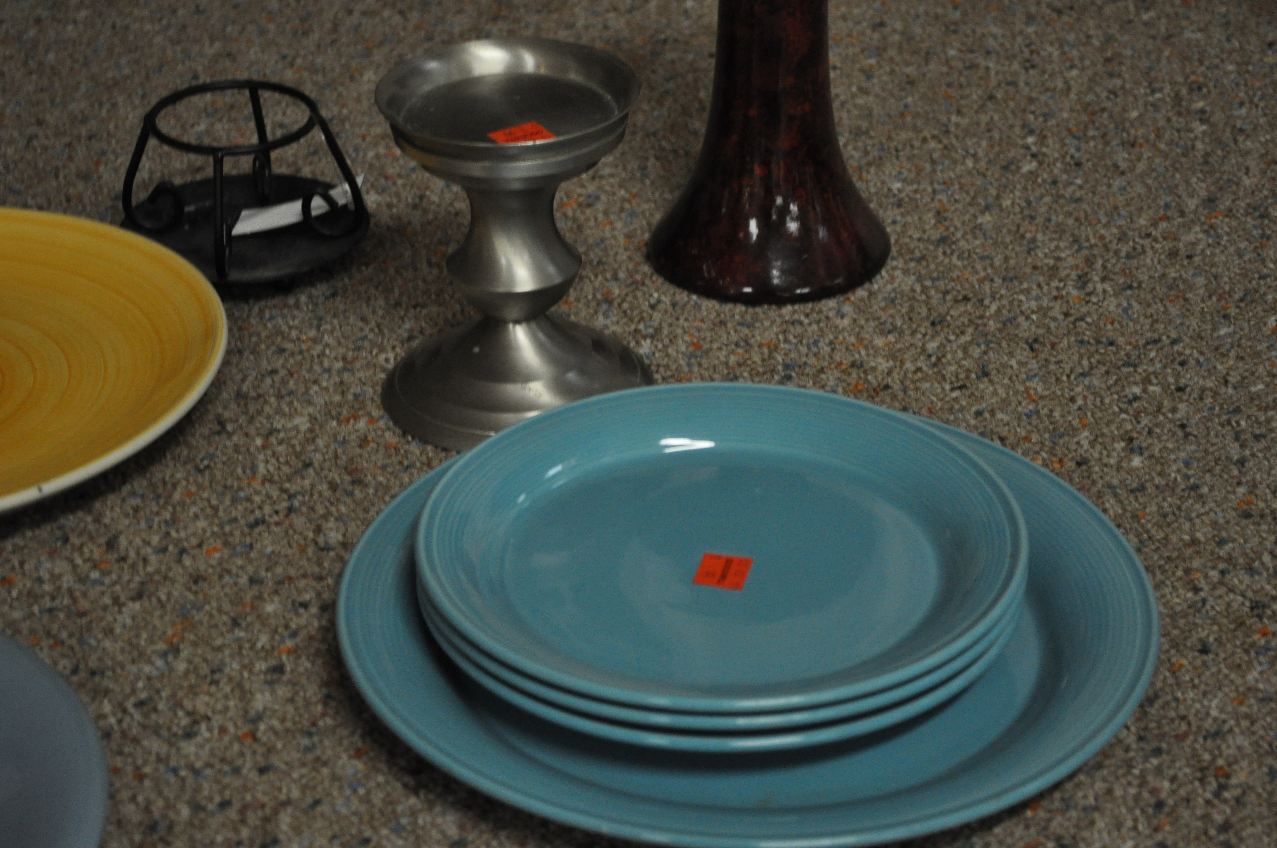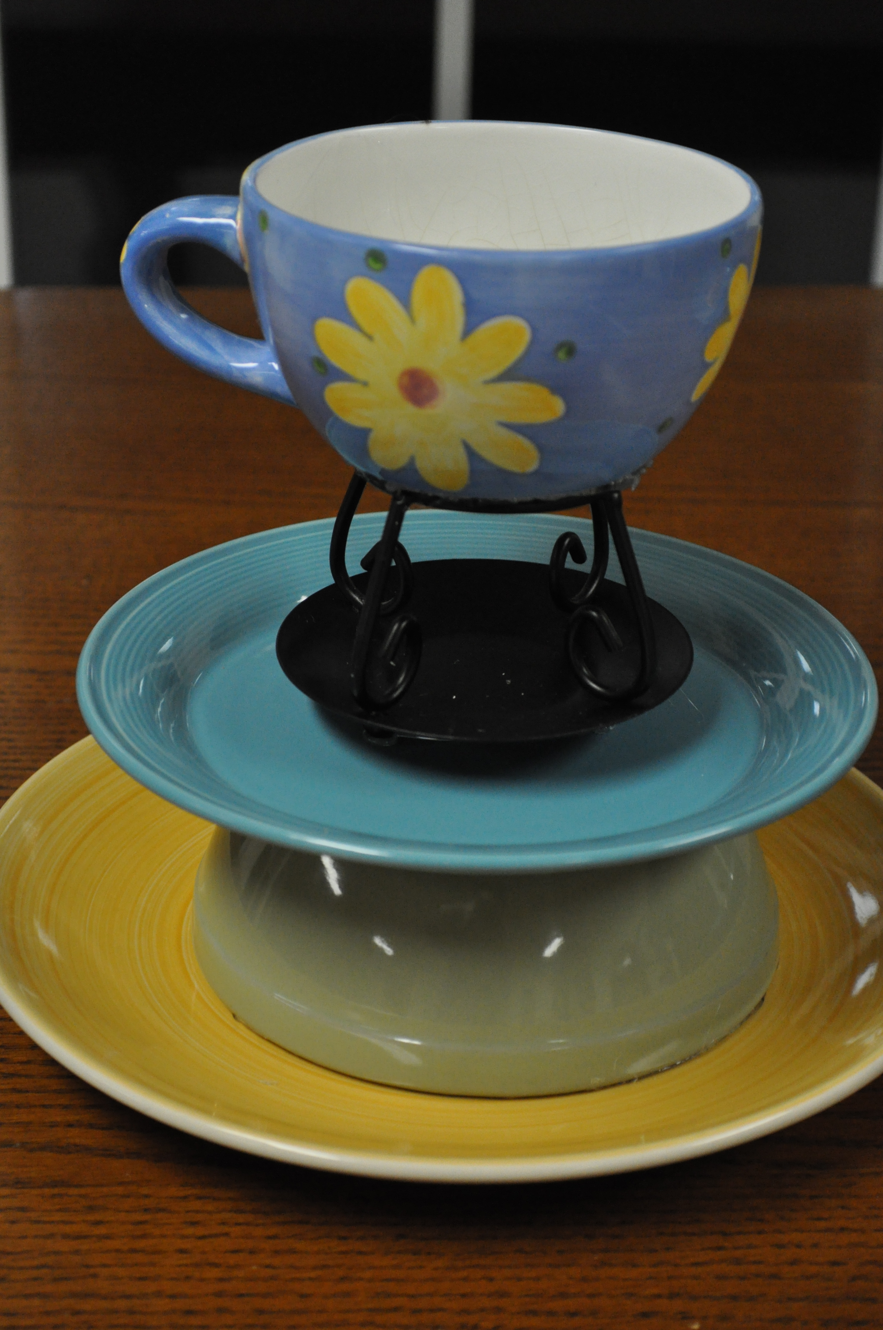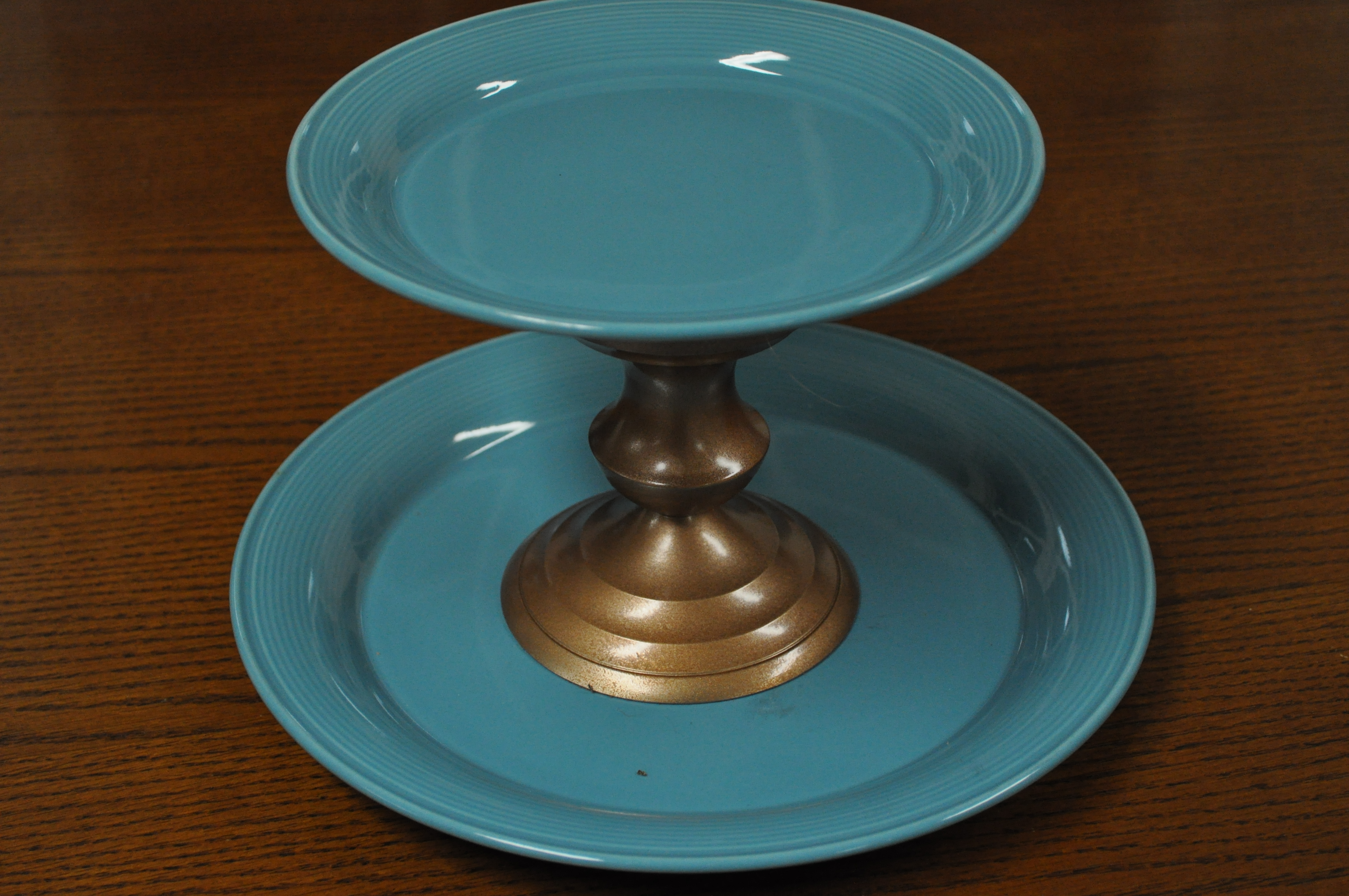 I’d been hearing my co-workers at school talk about these organizers for the bathroom that are made of plates, saucers, and candlesticks. Since it’s Christmas vacation and they had really good deals at GoodWill (and I needed an organizer for my counter)… I made one too. I started with this: