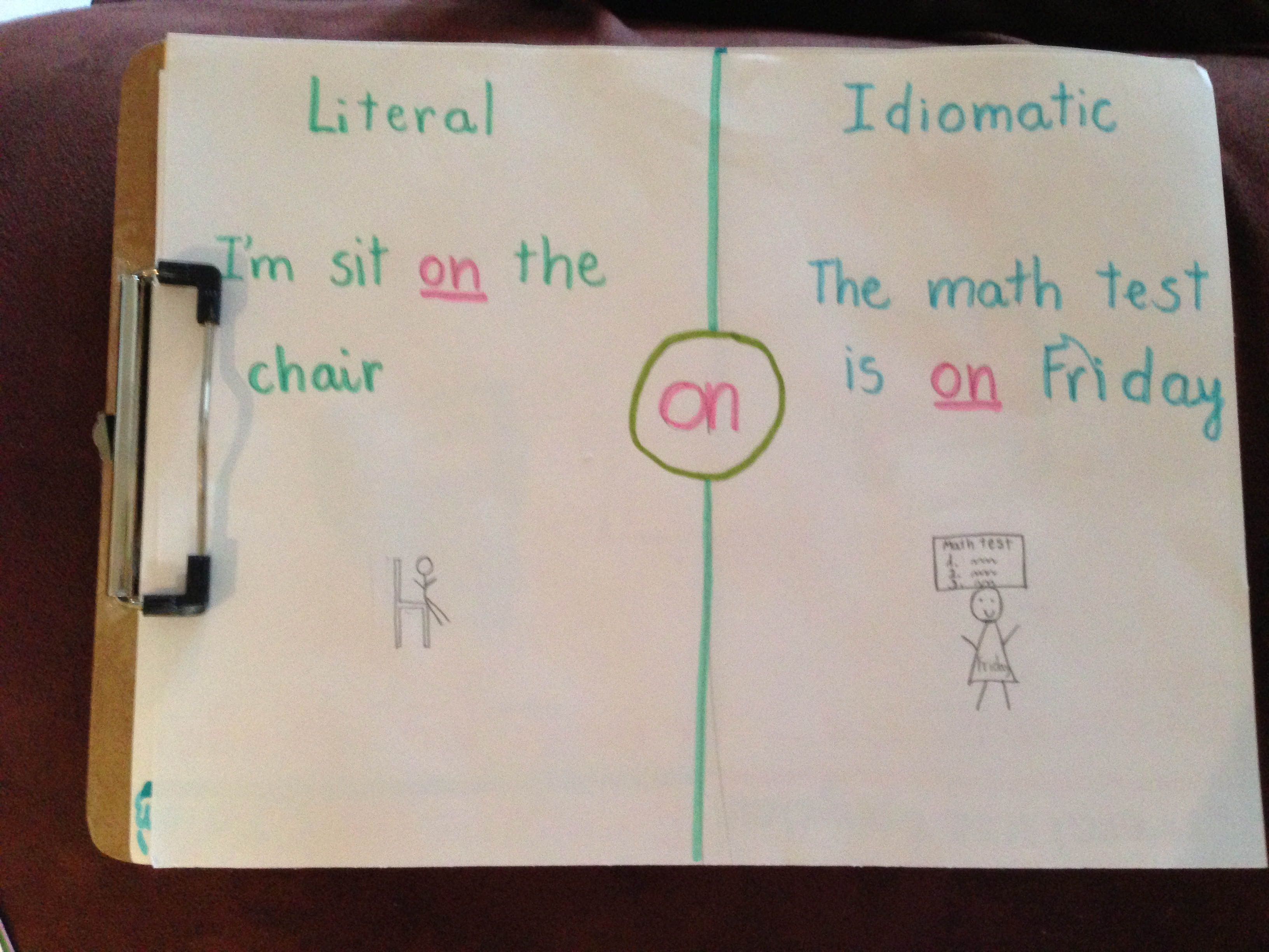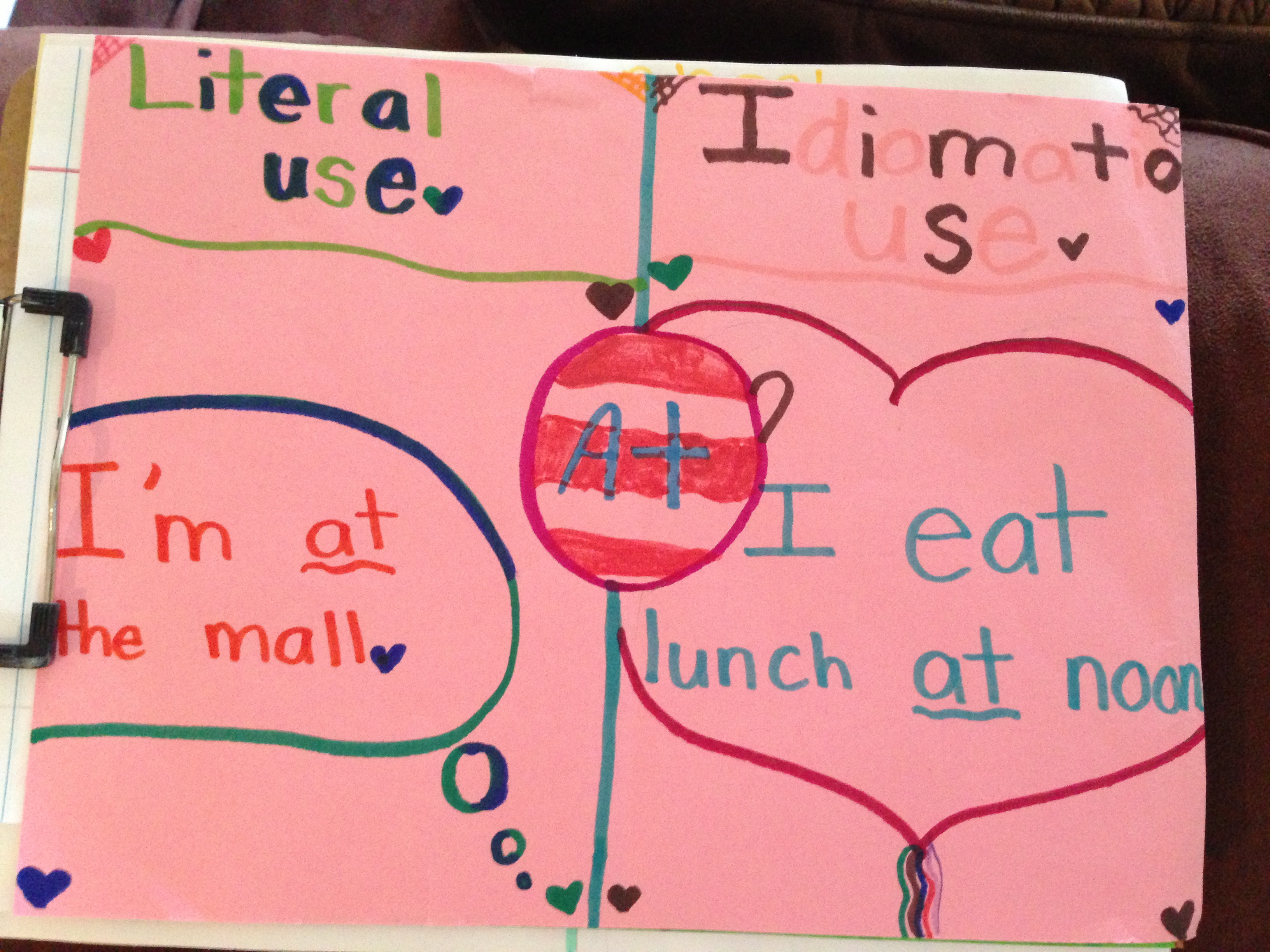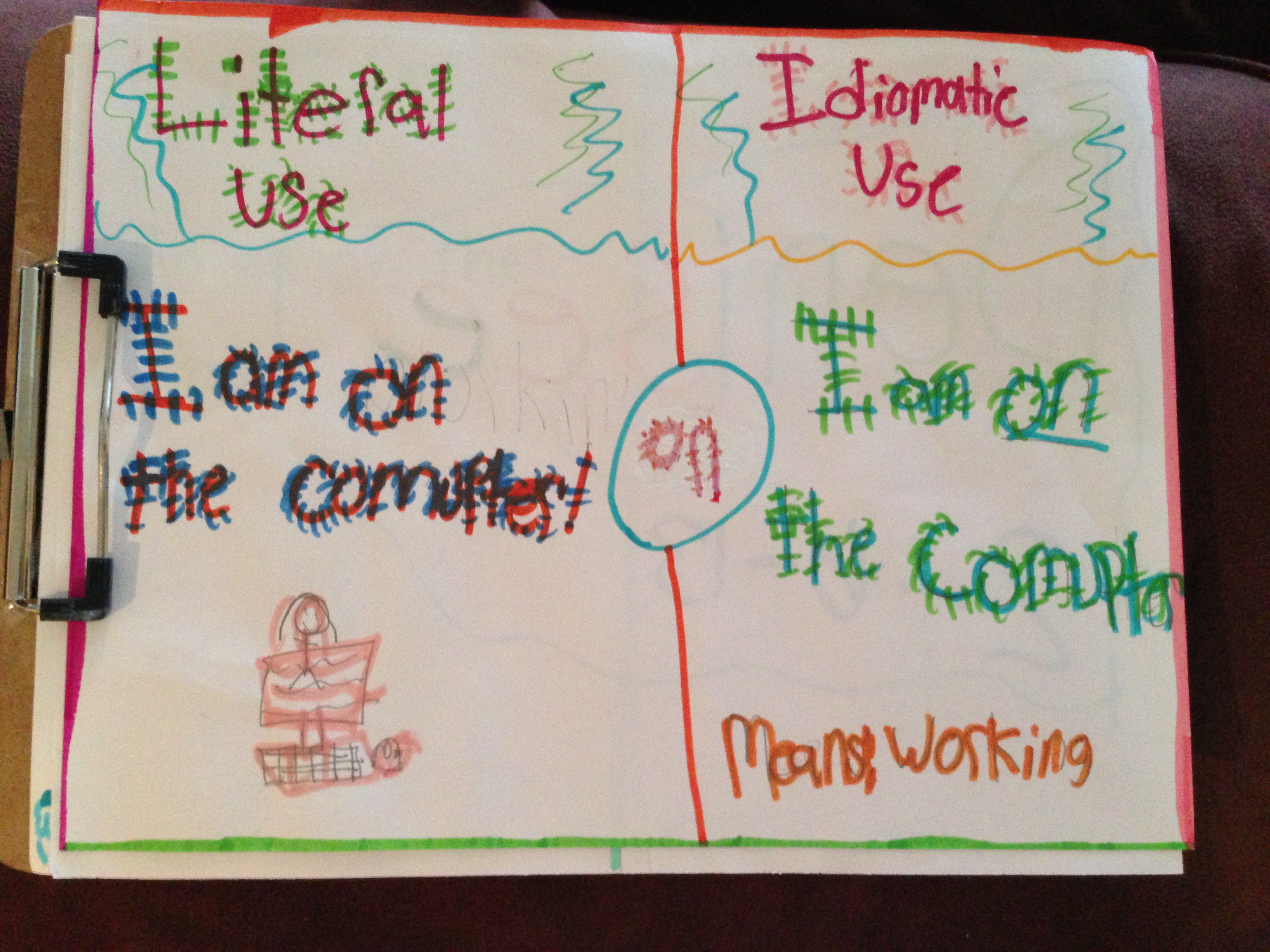 Prepositions: one of the hardest grammatical concepts for ELs. One of the things we practice is telling the difference between literal and figurative use of prepositions. After discussing prepositions as relationship/location words (see here), we discuss other phrases that use prepositions to talk about the locations/times of other things. The students then illustrate an example of both uses of a preposition. Here are some of the results:
