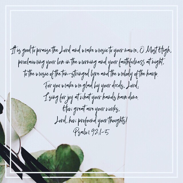 As feeble as our praise and music may feel, it is good for our hearts and pleasing to our Father to begin and end each day with them. Even to begin with this Psalm for the Sabbath… and for a Tuesday morning. May our praise beget more praise and our joy in the Lord’s goodness increase with our knowledge and experience of his faithfulness.