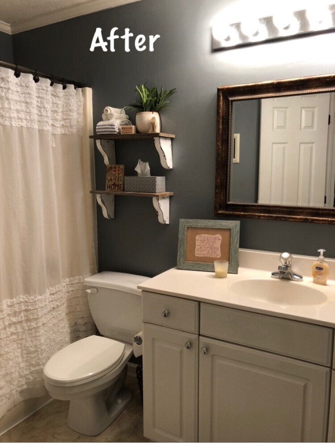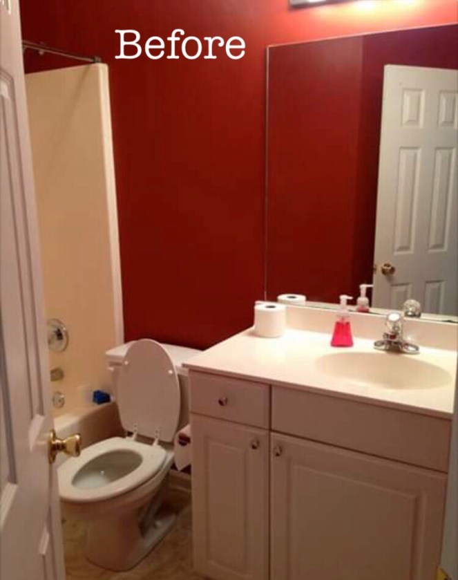 This is what it looked like on move-in day. Now, I’m not against red bathrooms… but I am against small, windowless, red bathrooms. I went in, closed the door, and felt like I was in a heart chamber. Bleh.