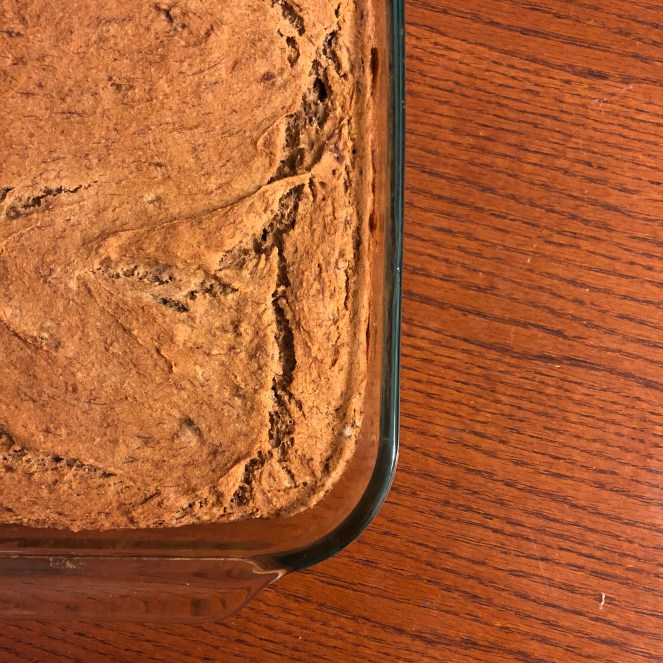 Grease an 9×13 pan with coconut oil. The batter will be thick, so smooth the top with a spatula after pour into pan. (This makes the bread look pretty. ❤️)