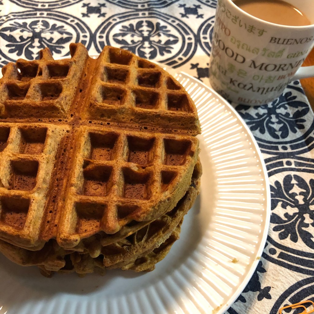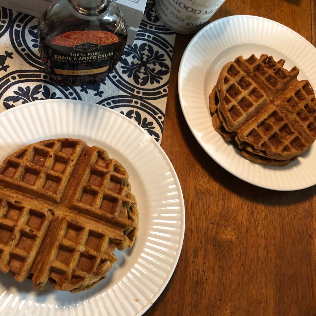 We were both craving Belgium waffles this morning, so I switched out a few ingredients to October-fy them. Hello pumpkin spice!
