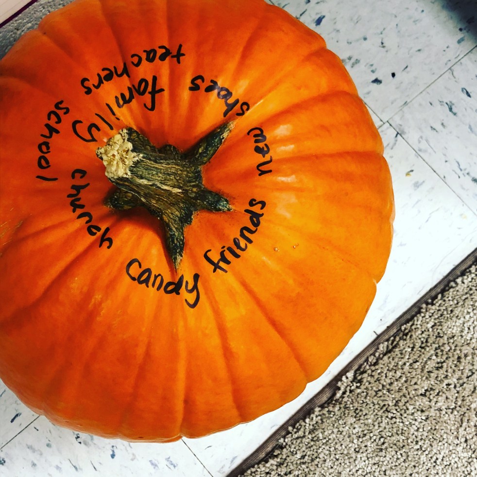 What my fifth-graders were thankful for this week. ❤️ Supplies needed: 2 minutes Largest pumpkin teacher can carry Sharpie The question: "What are you thankful for today?" Directions: repeat daily until December 1. Result: Smiles and redirected hearts after the Halloween craziness.